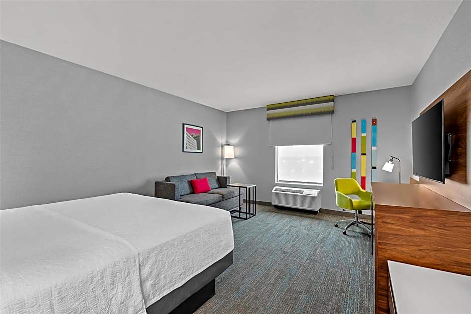 A flat-screen cable TV is provided in this hearing-accessible room, along with a microwave, fridge, and coffeemaker.